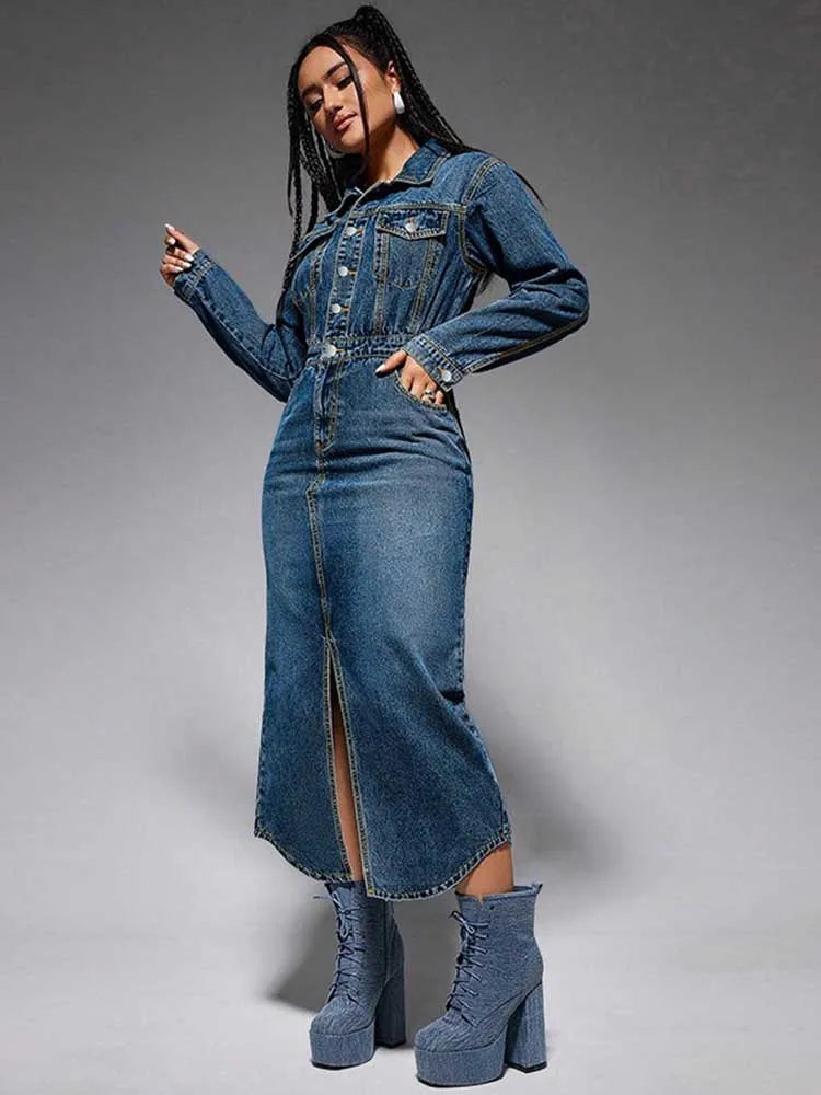 Step into timeless style with this Turn-Down Collar Denim Maxi Dress, designed for effortless sophistication. Featuring full-length sleeves and a flattering ankle-length cut, this dress blends structure with casual ease. Perfect for creating women's fall outfit 2025 looks, autumn outfit dress inspiration, or day-to-night outfit ideas, it's a must-have for seasonal transitions. Pair with boots, heels, or pastel color outfits for added charm. Whether you're dressing for brunch or looking for outfits for beach pictures with a twist, this denim dress delivers every time.