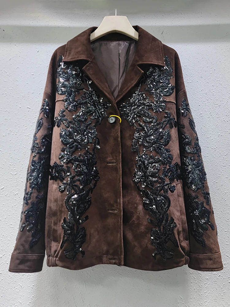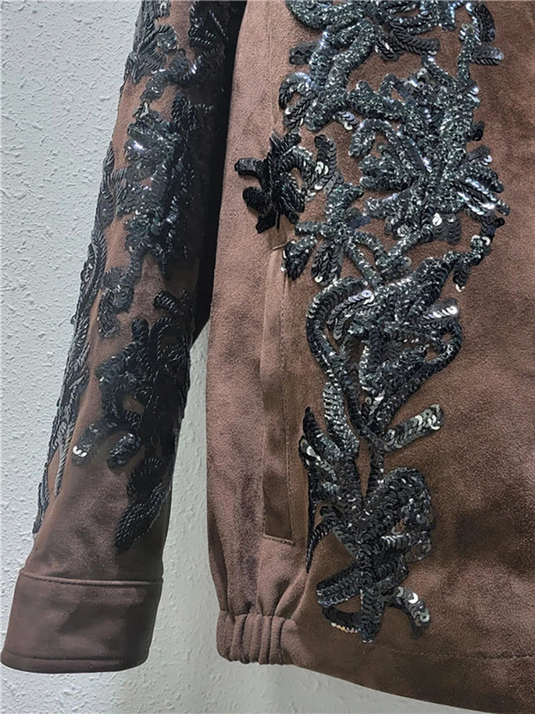 Make a statement with the Notched Collar Sequin Embroidery Suede Blazer, designed for women who love elegance and style. The notched collar enhances the silhouette, while the detailed sequin embroidery adds a touch of glamour, ideal for women’s clothing sets, office wear, or standout evening outfits.