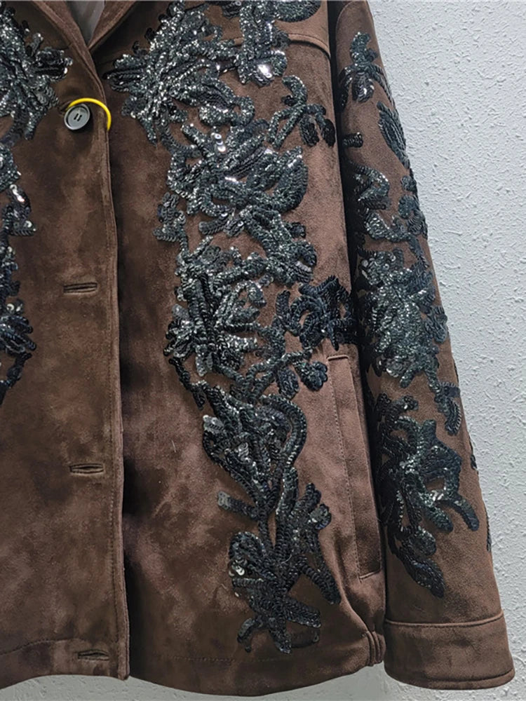 Notched Collar Sequin Embroidery Suede Blazer