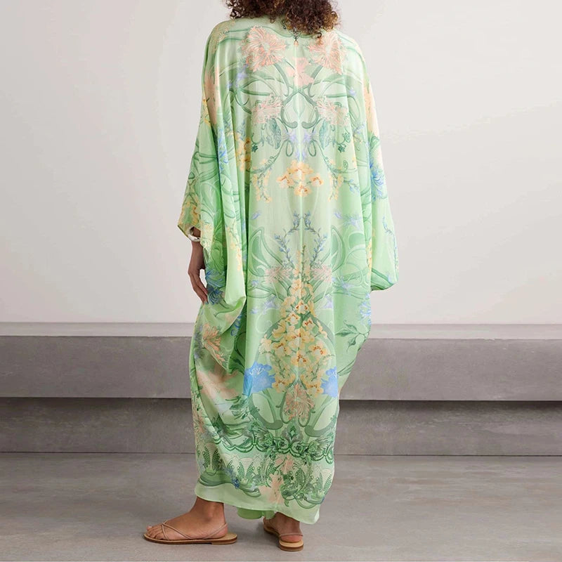 Featuring a flattering V-neckline, dramatic flare sleeves, and a floor-length silhouette, it’s the go-to choice for everything from beach vacations to garden parties, casual brunches, or even resort evenings. The light stretch offers comfort without compromising on flow and grace.