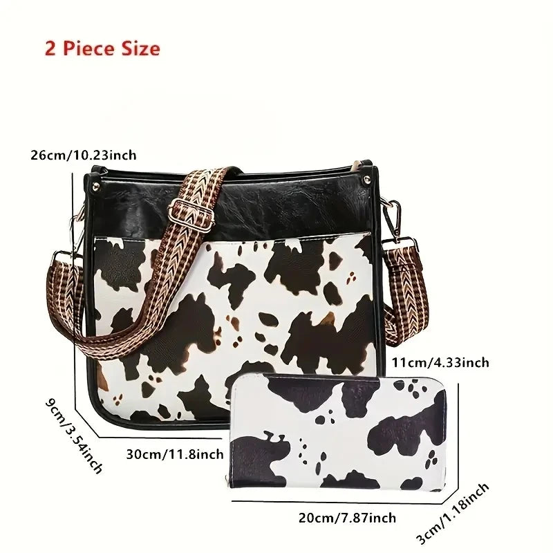 Add a playful touch to your outfit with this 2pcs Cow Pattern Shoulder Bag, crafted from durable faux PU leather for long-lasting style. Featuring a vintage-inspired strap and spacious interior with a slot pocket, it’s perfect for carrying your daily essentials. Lightweight and soft, this versatile crossbody bag suits casual outings, shopping, or everyday use. Make a bold fashion statement while keeping your belongings organized with this chic and fun handbag.