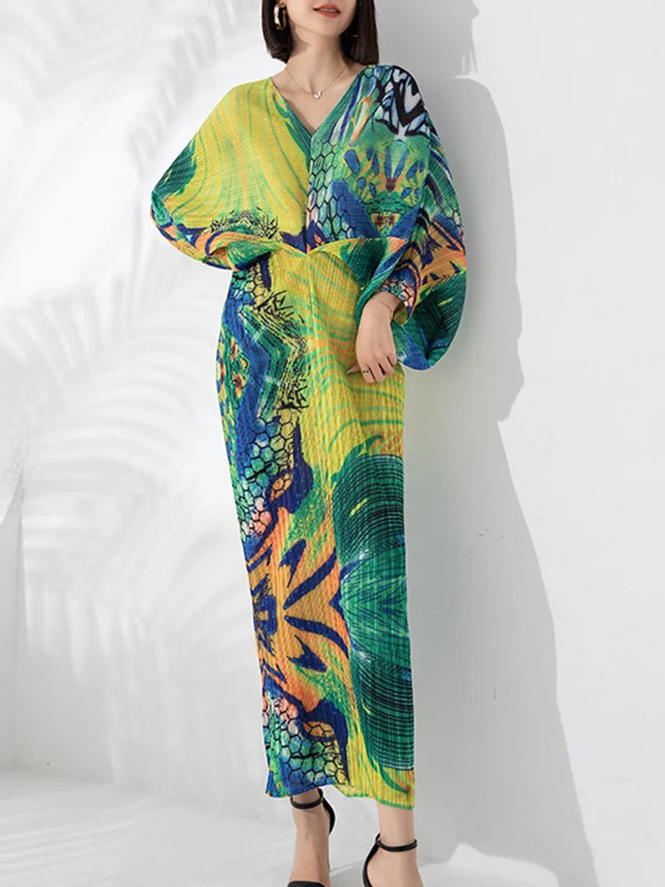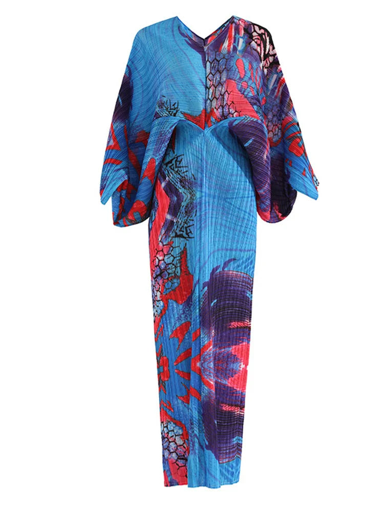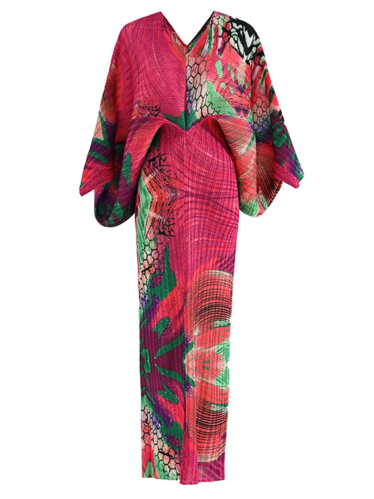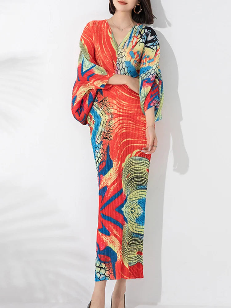 Elevate your style with the Miyake Abstract Print Pleated Dress a luxurious, high-end piece designed to impress. Crafted from premium polyester with high stretch for comfort, this dress features elegant batwing sleeves and a flattering V-neckline. The exquisite abstract print combined with delicate pleats adds a sophisticated artistic touch. Perfect for any special occasion or upscale event, this mid-calf length dress offers effortless elegance and timeless appeal. Pull on this dress and make a statement wherever you go.
