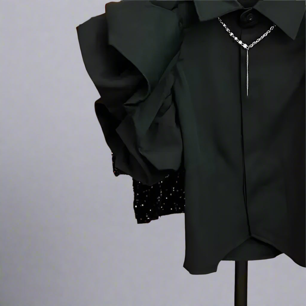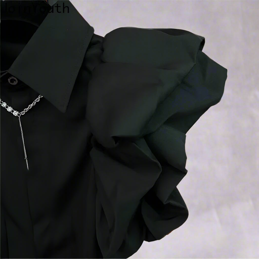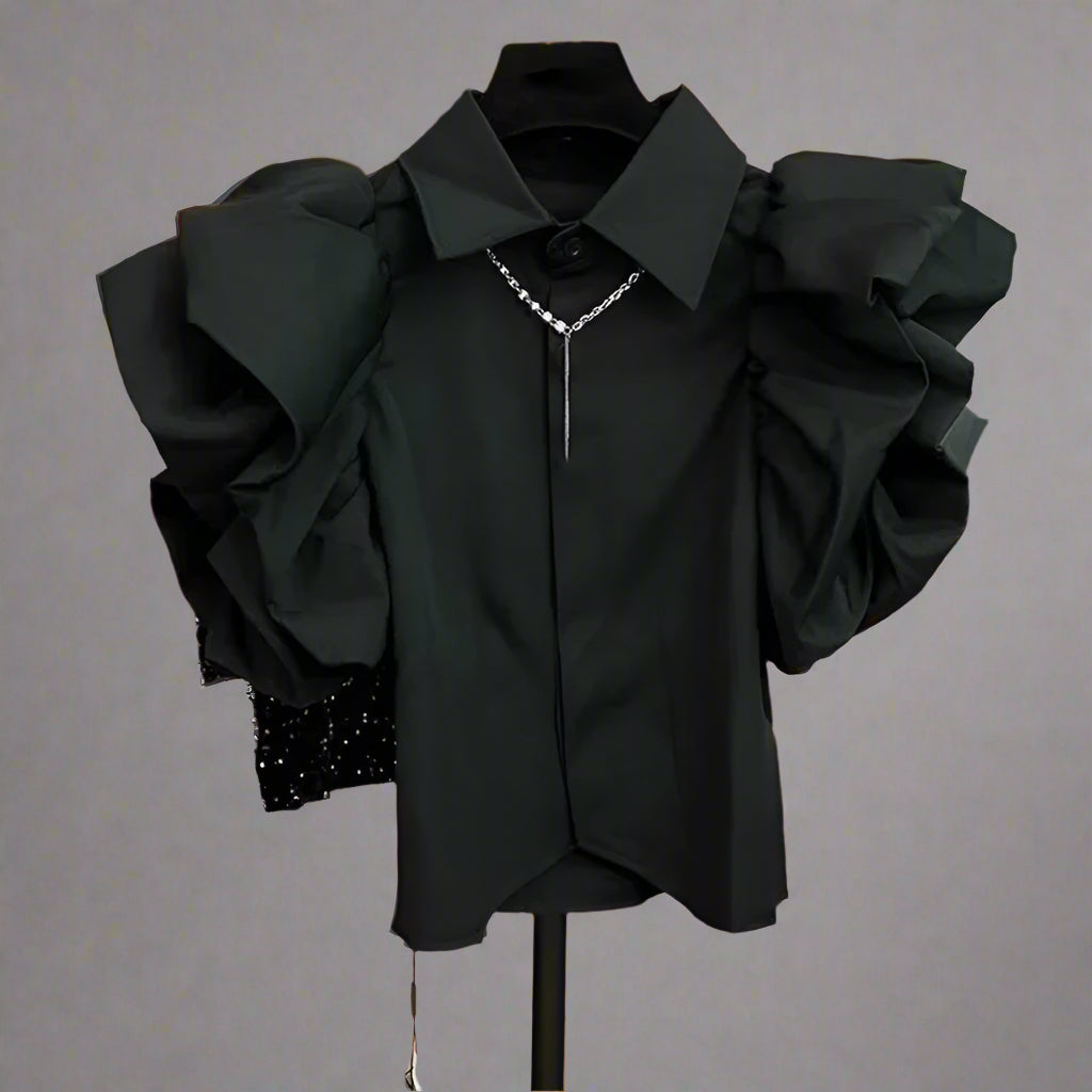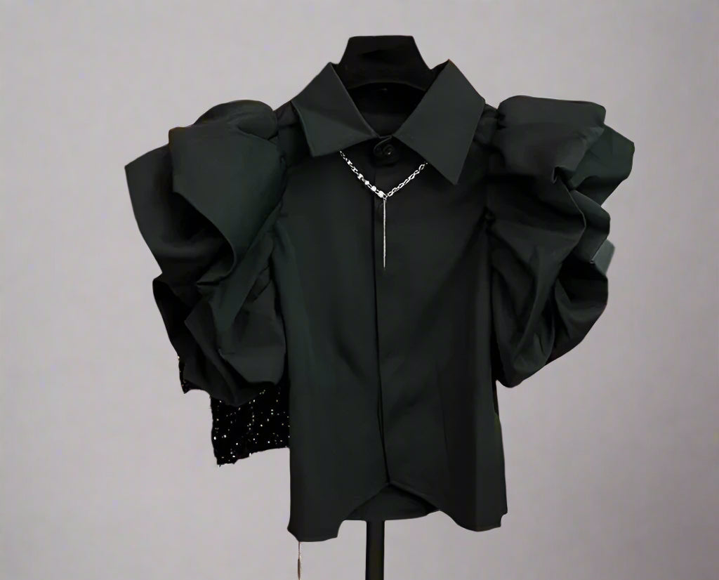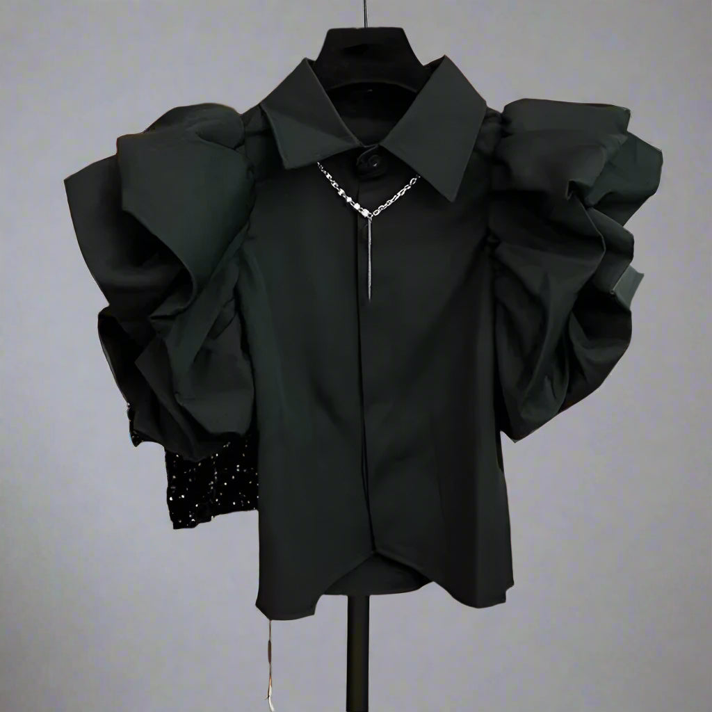 Exaggerated Ruffled Sleeve Black Slim Fit Blouses