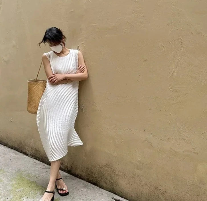 Bright Solid Color Sleeveless Pleated Stretch Dress