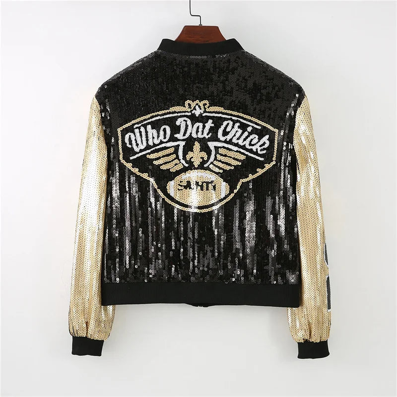 Support your favorite team in style with the Who Dat Chic! Sequin Bomber Jacket. Adorned with fully sequined material, this jacket is perfect for showing off your spirit. The junior cut and pocketless design make it comfortable and distraction-free while you cheer on the Saints.
